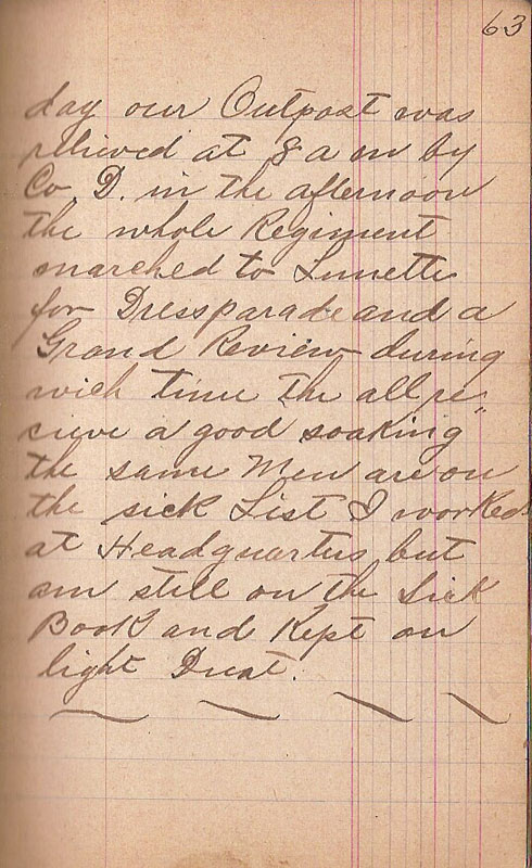 day our Outpost was relieved at 8 am by Co D in the afternoon the whole Regiment marched to Lumettes for Dressparade and a Grand Review during wich time the all recieve a good soaking the same Men are on the sick List I worked at Headquarters but am still on the Sick Book and kept on light Duty. |