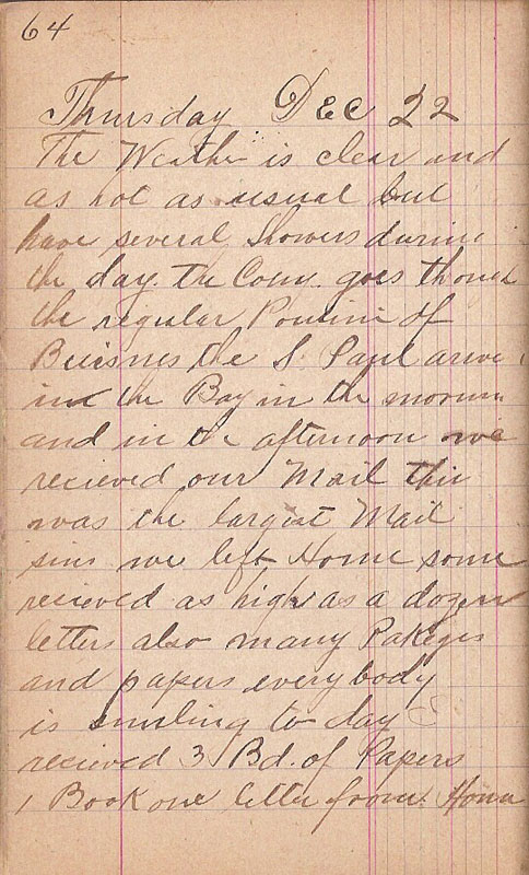 The Weather is clear and as hot as usual but have several Showers during the day the Comp goes through the regular Routine of Buisnes the S Paul arive in the Bay in the mornin and in the afternoon we recieved our Mail this was the largest Mail sins we left Home some recieved as high as a dozen letters also many Packages and papers every body is smiling to day I recieved 3 Bd. of Papers 1 Book one letter from Honu |