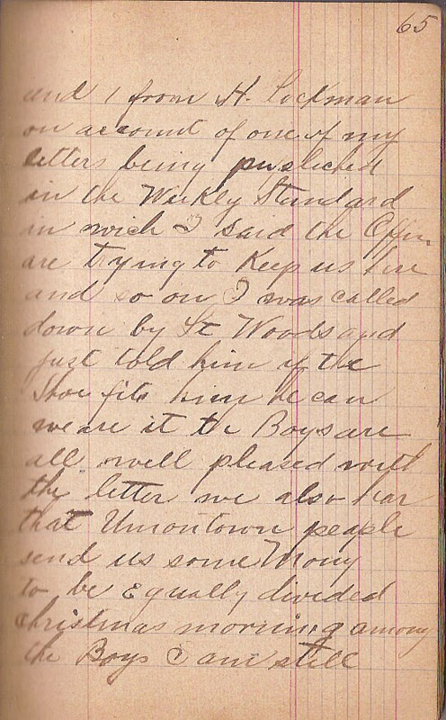 and 1 from H Lackman on account of my letters being pupliched in the Weekly Standard in wich I said the Offic. are trying to heep us here and so on I was called down by Lt Woods and just told him if the Shoe fits him he can weare it the Boys are all well pleased with the letter we also hear that Uniontown people send us some Mony to be equally divided christmas morning among the Boys & am still |