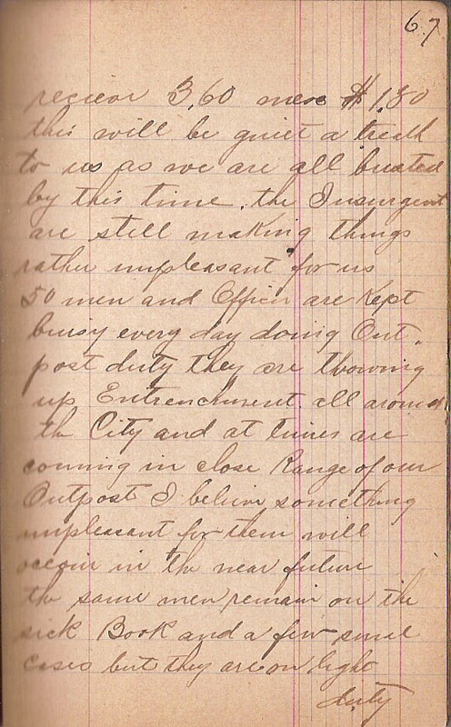 recieve 3.60 (illegible – "mese" maybe) $1.80 this will be quiet a treath to us as we are all busted by this time the Insurgent are still making things rather unpleasant for us 50 men and Officer are kept buisy every day doing Outpost duty they are throwing up Entrenchment all around the City and at times are coming in close Range of our Outpost I believe something unpleasant for them will occour in the near future the same men remain on the sick Book and a few smal cases but they are on light duty |