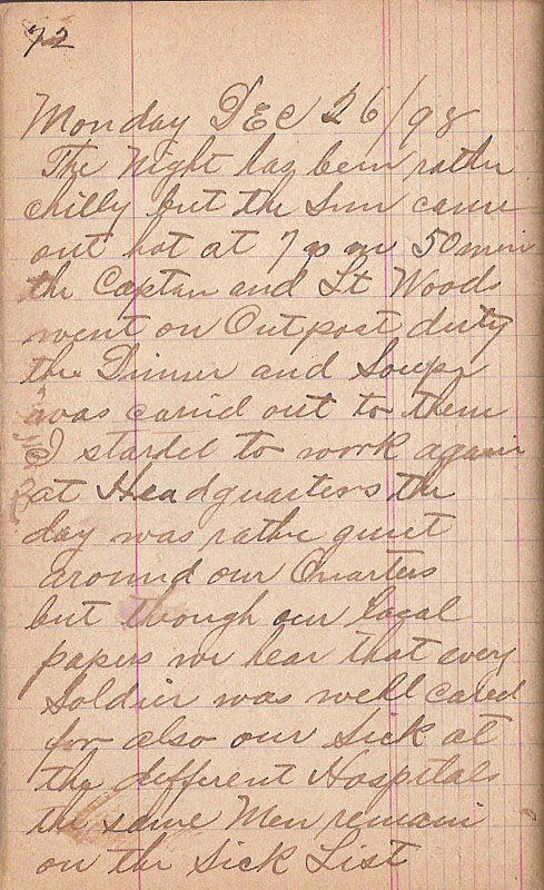 The Night has been rather chilly but the Sun came out hot at 7 pm 50 men the Captan and Lt Woods went on Outpost duty the Dinner and Souper was carried out to them I startet to work again at Headquarters the day was rather quiet around our Quarters but through our local papers we hear that every Soldier was well cared for also our Sick at the different Hospitals the same Men remain on the Sick List
