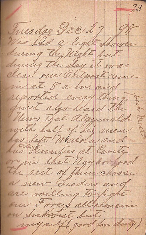 We had a light Shower during the Night but during the day it was clear our Outpost came in at 8 am and reported every thing quiet also heard the News that Alguinaldo with half his men has left Malola and has taken Quarters at Cavite or in that Nayborhood the rest of them choose a new Leader and are willing to fight our Forces all remain on Sick List but myself (good for duty) fresh Meat |