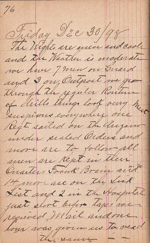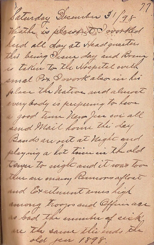 Weather is pleasant I worked hard all day at Headquarters this being Issue day and Brain is taken to the Hospital with smal pox I work also in his place the Natives and almost everybody is preparing to have a good time New Jear eve all send Mail home this day Bands are out at Night and playing a hot time in the old town to night and it was too there are many Rumors afloat and Excitement runs high among the troops and Officer are as bad the number of sick are the same this ends the old year of 1898