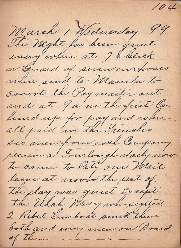 The Night has been quiet every where at 7 o Clock a Guard of seven on Horses where send to Manila to escort the Paymaster out and at 9 am the first Co lined up for pay and where all paid in the Trenches six men fron each Company recieve a Fourlough daily now to come to City our Mail leave at noon the rest of the day was quiet except the Utah Wavy who sighted 2 Rebel Gunboat sunk them both and every men on Board of them