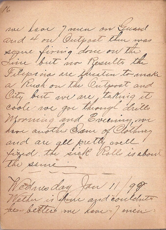 we have 7 men on Guard and 4 on Outpost their was some firing done on the Line but no Results the Filipinos are threaten to make a Rush on the Outpost and City but we are taking it coole we goe through drills Morning and Evening we have another Isue of Clothing and are all pretty well fixed the sick Rolls is about the same