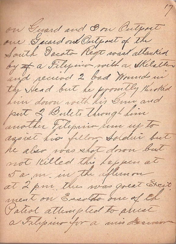on Guard and 3 on Outpost one Guard on Outpost of the South Dacoto Regt was attacked by a Filipino with a Skelalter and recieved 2 bad Wounds in the Head but he promptly knoked him down with his Gun and put 2 Bulets through him another Filipino run up to assist his fellow Soldier but he also was shot down but not Killed this happen at 5 a.m. in the afternoon at 2 p.m. ther was great excitment on Essolto one of the Patrol attempted to arrest a Filipino for a misdemenor
