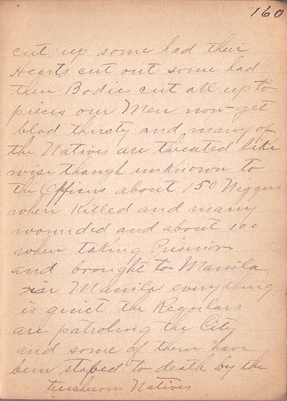 cut up some had their Hearts cut out some had their Bodies cut all up to pieces our Men now get blod thirsty and many of the Native are threated likewise though unknown to the Officers about 150 Niggers where Killed and many wounded and about 100 where taking Prisoner and broght to Manila in Manila everything is quiet the Regulars are patroling the City and some of them have been stabed to death by the treacherous Natives. Tuesday April 11/99