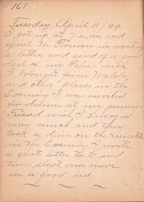 I got up at 7 a.m. and spent the Fornoon in writing a letter and send of a good seal of my Relics wich I brought from Malolas and other places in the Evening I was invited for dinner at my german Friend wich I enjoyed verry much and then in the Evening I wrote a short letter to G and then slept ones more in a good bed