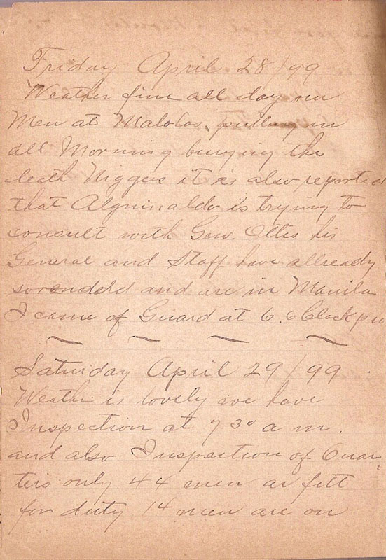 Weather fina all days our Men at Malolas putting in all Morning burying the death Niggers it is also reported that Alguinaldo is trying to consult with Gen Ottis his General and Staff have allready surenderd and are in Manila I came of Guard at 6 o Clock pm