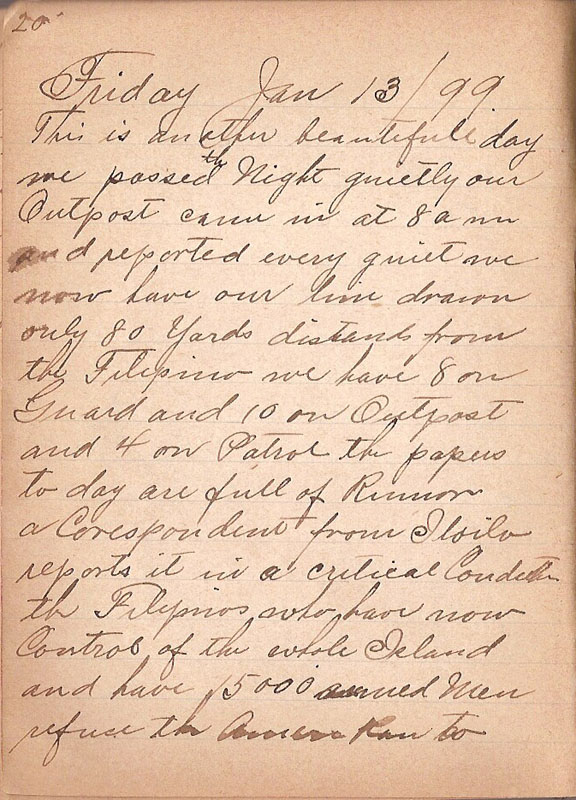 This is another beautifull day we passed the Night quietly our Outpost came in at 8 am and reported every quiet we now have our line drawn only 80 Yards distants from the Filipino we have 8 on Guard and 10 on Outpost and 4 on Patrol the papers to day are full of Rumor a Corespondent from Iloilo reports it in a critical Condition the Filipinos who have now Control of the whole Island and have 15000 armed Men refuse the Amerikan to