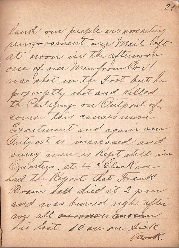 land our people are awaiting reinforsment our Mail left at noon in the afternoon one of our Men from Co H was shot in the Foot but he promptly shot and Killed the Philipinio on Outpost of course this causes more Ecitment and again our Outpost is increased and every men is Kept still in Quarters at 4 o Clock we had the Report that Frank Brain had died at 2 pm and was buried right after we all mourn his lost 10 are on Sick Book.