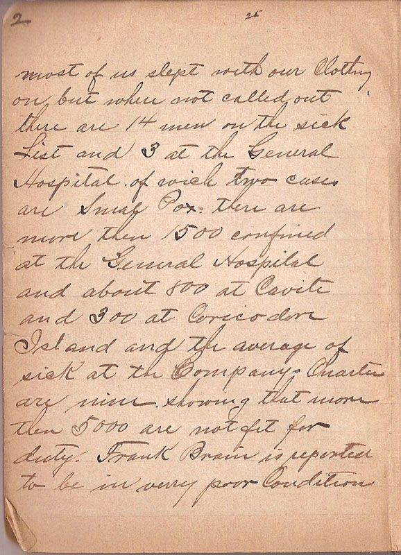 | most of us slept with our Clothing on but where not called out there are 14 men on the sick List and 3 at the General Hospital of wich two cases are are Smal Pox there are more then 1500 confined at the General Hospital and about 800 at Cavite and 300 at Coricodore Island and the average of sick at the Company Quarters are mine showing that nore then 500 are not fit for duty. Frank Brain is reported to be in verry poor Condition |