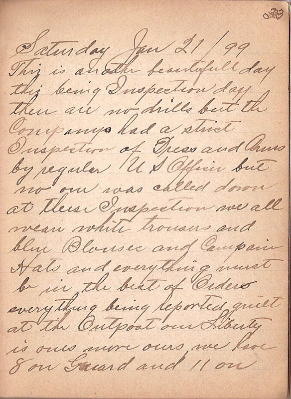 This is another beautifull day this being Inspection day there are no drills but the Companys had a strict Inspection of Dress and Arms by regular U S Officerbut no one was called down at theese Inspection we all wear white trousers and blue Blouses and Compain Hats and everything must be in the best of Order everything being reported quiet at the Outpost our Liberty is ones more ours we have 8 on Guard and 11 on |