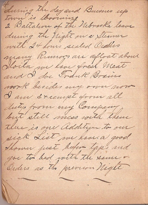 | during the day and Buisnes up town is booming 2 Battalion of the Nebraska leave during the Night on a Steamer with 24 hours sealed Orders many Rumors are afloat about Hoila we have Fresh Meat and I doe Frank Brains work besides my own now I am excempt from all duty from my Company but still mess with them there is one Addition to our sick List we have a good Shower just befor taps and goe to bed with the same Orders as the previous Night |