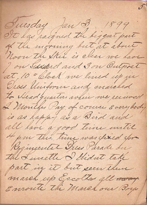 It has raigned the biggest part of the morning but at about Noon the Skie is clear we have 7 on Guard and 3 on Outpost at 10 o Clock we lined up in Dress Uniform and marched to Headquarters where we recieved 2 Months Pay of course everybody is as happy as a Bird and all have a good time until 4 pm this time was fixed for Regimental Dress Parade on the Lunette I didnt take part in it but seen them march up Escolta all enrorite the March our Boys |