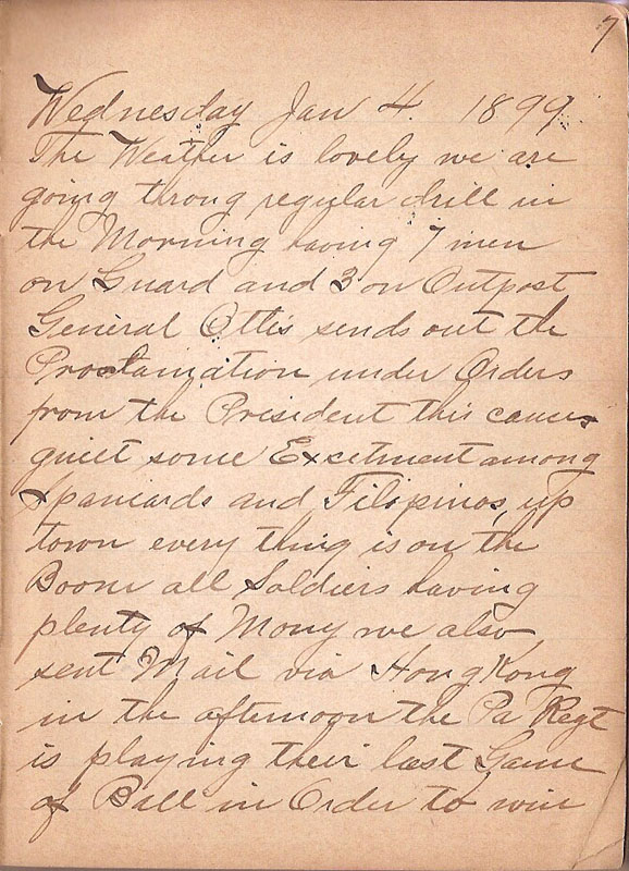 The Weather is lovely we are going throug regular drill in the Morning having 7 men on Guard and 3 on Outpost General Ottis sends out the Proclaimation under Orders from the President this causes quiet some Excitment among Spaniards and Filipinos up town every thing is on the Boom all Soldiers having plenty of Mony we also sent Mail via Hong Kong in the afternoon the Pa Regt is playing their last Game of Ball in Order to win the