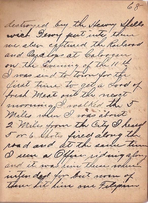 | destroyed by the Heavy Shells wich Dewy put into them we also captured the Railroad and Oarshops at Caloogan on the Evening of the 11th I was send to town for the first time to get a Load of fresh Meat out the mesct morning I walked the 5 Miles when I was about 2 Miles from the City I heard 5 or 6 Shots fired along the road and at the same time I seen a Officer riding along and it was him these where intended for but none of them hit him our Filipino |