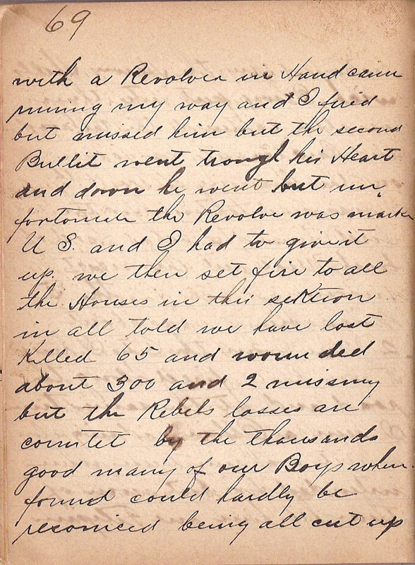 with a Revolver in Hand came running my way and I fired but missed him but the second Bullit went trough his Heart and down he went but unfortunate the Revolver was marked US and I had to give it up we then set fire to all the Houses in this sektion in all told we have lost Killed 65 and wounded about 300 and 2 missing but the Rebels losses are counted by the thousands good many of our Boys when found could hardly be reconised being all cut up |