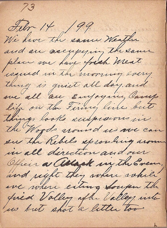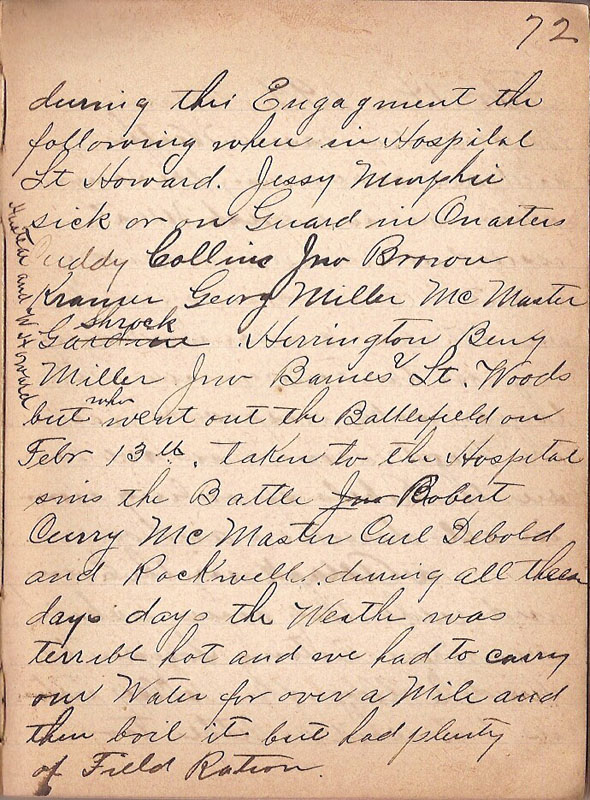 | during this Engagement the following where in Hospital Lt Howard Jessy Murphie Hustead and W Howard sick or on Guard in Quarters Cuddy Collins Jno Broron Kramer Georg Miller McMaster Shrock Herrington Berry Miller Jno Barnes & Lt. Woods but who went out on the Battlefield on Febr 13th. taken to the Hospital sins the Battle Robert Curry McMaster Carl Debold and Rockwell during all these days the Weather was terrible hot and we had to carry our Water for over a Mile and then boil it but had plenty of Field Ration |