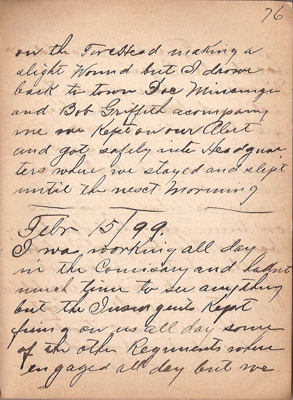 I was working all day in the Comisary and hadnt much time to see anything but the Insurgents Kept firing on us all day some of the other Regiments where engaged all day but we |