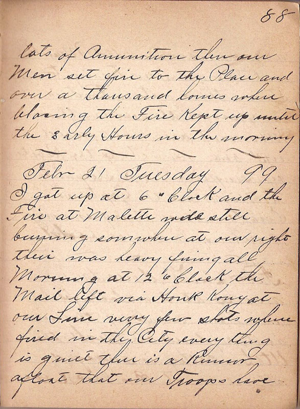 I got up at 6 o Clock and the Fire at Malette was still burning somewhere at our right their was heavy firing all Morning at 12 o Clock the Mail left via Houk Kouy at our Line verry few shots where fired in the City everything is quiet their is a Rumor afloat that our Troops have |