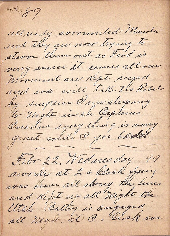 allready sorounded Marrola and they are now trying to starve them out as Food is verry scarce it seems all our Movement are Kept secred and we will take the Rebels by surprice I am sleeping to Night in the Captains Quarters every thing is verry quiet while I goe to bed