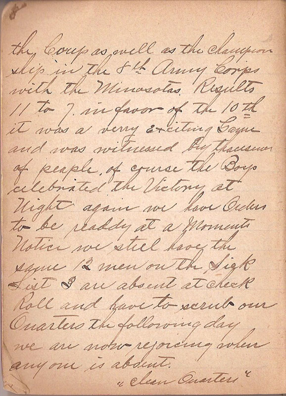 | Coup as well as the championship in the 8th Army Corps with the Minasotas Results 11 to 7 in favor of the 10th it was a verry exciting Game and was witnessed by Thausens of people of course the Boys celebrated the Victory at Night again we have Orders to be readdy at a Moments Notice we still have the same 12 men on the Sick List 3 are absent at check Roll and have to scrub our Quarters the following day we are now rejoicing any our absent "clen Quarters" |