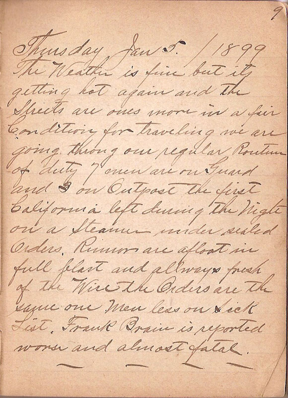 The Weather is fine but its getting hot again and the Streets are ones more in a fair Condition for traveling we are going throug our regular Routine of duty 7 men are on Guard and 3 on Outpost the first California left during the Night on a Steamer under sealed Orders Rumors are afloat in full blast and allways fresh of the Wire the Orders are the same one Men less on Sick List Frank Brain is reported worse and almost fatal. |