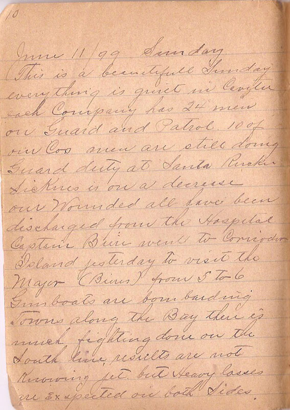 This is a beautifull Sunday everything is quiet in Cavite each Company has 24 men on Guard and Patrol 10 of our Cos men are still doing Guard Duty at Santa Ruckie Sicknes is on a decrease our Wounded all have been discharged from the Hospital Captain Biere went to Coricodor Island yesterday to visit the Major (Bierer) from 5 to 6 Gunboats are bombarding Towns along the Bay there is much fighting down on the South line results are not Knowing yet but Heavy losses are exspected on both Sides |