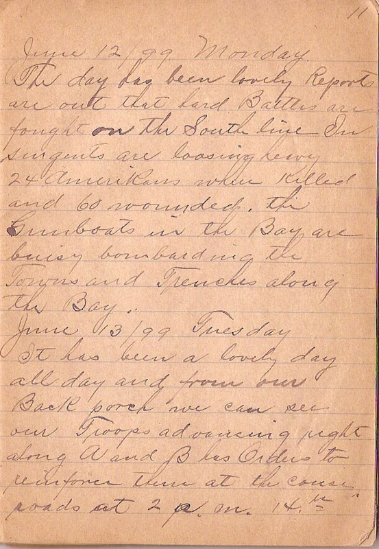 The day has been lovely Report are out that hard Battles are fought on the South line Insurgents are loosing heavy 24 Amerikans where Killed and 60 wounded. the Gunboats in the Bay are buisy bombarding the Towns and Trenches along the Bay