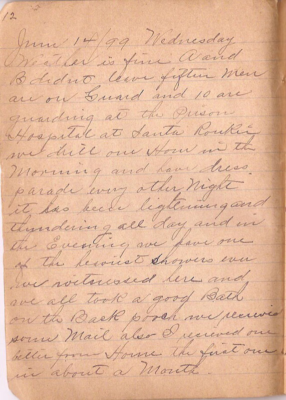 Weather is fine A and B didn't leave fifteen Men are on Guard and 10 are guarding at the Prison Hospital at Santa Roukie we drill one Hour in the Morning and have dress parade every other Night it has beein lightning and thundering all day and in the Evening we have one of the heaviest Showers ever we witnessed here and we all took a good Bath on the Back porch we recieved some Mail also I recieved one letter from Home the first one in about a Month |
