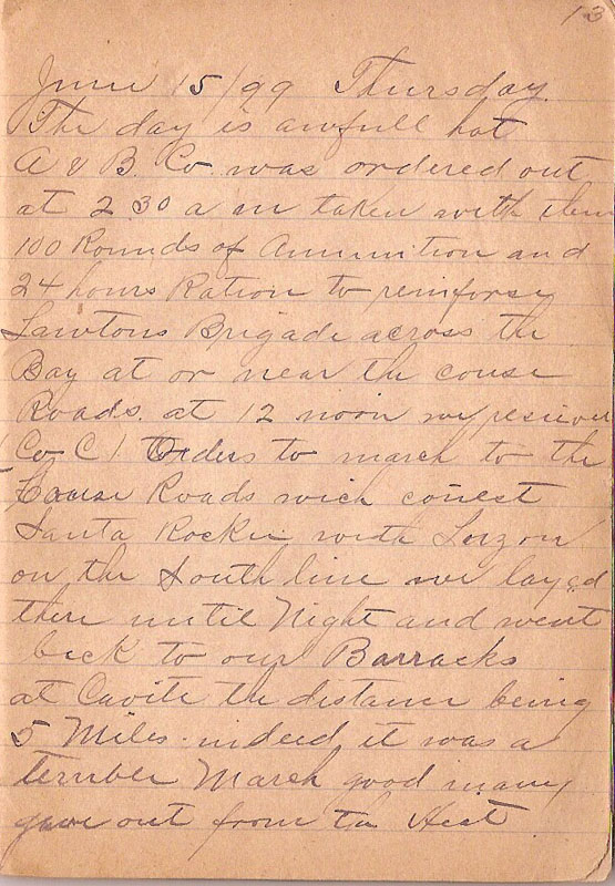 The day is awfull hot & B Co was ordered out at 230 am an taken with them 100 Rounds of Amunition and 24 hours Ration to reinforce Lawtons Brigade across the Bay at or near the couse Roads at 12 noon we recieve (Co C) Orders to march to the Corse Roads wich conect Santa Rocku with Luzon on the South line we layed there until Night and went back to our Barracks at Cavite the distance being 5 miles indeed it was a terrible March good many gave out from the Heat |