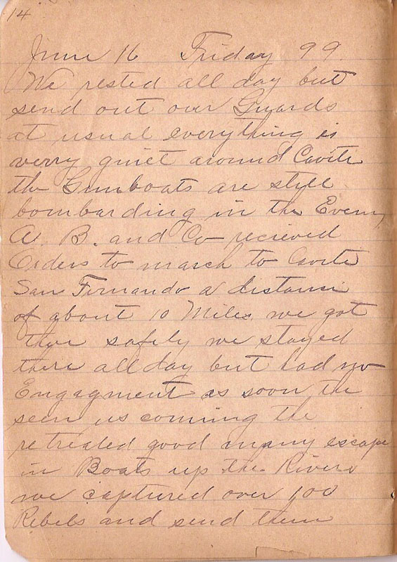 We rested all day but send out our Guards at usual everything is verry quiet around Cavite the Gunboats are still bombarding in the Evening A C and C recieved Orders to march to Cavite San Fernando a distance of about 10 Miles we got there safely we stayed there all day but had no Engagement as soon the seen us coming the retreated good many escape in Boats up the Rivers we captured over 100 Rebels and send them