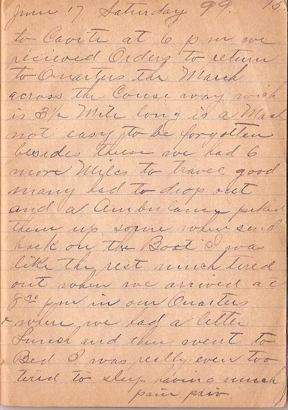 to Cavite at 6 pm we recieved Orders to return to Quarters the March across the Couse way wich is 3 1/2 Mile long is a March not easy to be forgotten besides these we had 6 more Miles to travel good many had to drop out and a Ambulance piked them up some where send back on the Boat I was like the rest much tired out when we arrived at 830 pm in our Quarters where we had a little Lunch and then went to Bed I was really even too tired to sleep having much pain pain