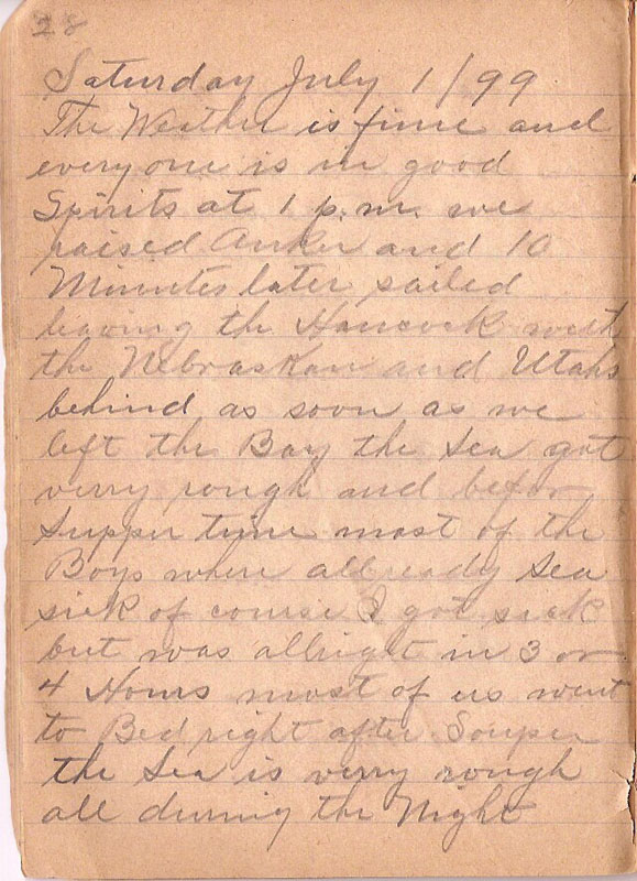 The Weather is fine and overyone is in good Spirits at 1 p.m. we raised Anker and 10 Minutes later sailed leaving the Hancock with the Nebraskan and Utahs behind as soon as we left the Bay the Sea got verry rough and befor Supper time most of the Boys where all ready Sea sick of course I got sick but was allright in 3 or 4 Hours most of us went to Bed right after Souper the Sea is verry rough all during the Night |