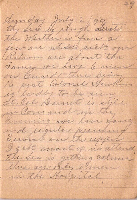 the Sea is rough but the Weather is fine a few are still sick our Ration are about the Same we have 6 men on Guard there being 16 post Colonel Hawkins is hardly to be seen Lt. Col Barnet is still in Comand in the Evening we have Song and regular preeching Service on the upper Deak most of us attend the Sea is getting calmer there are only 6 men in the Hospital |