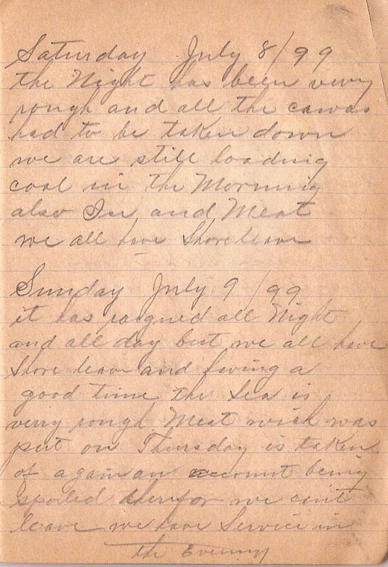 the Night has been verry rough and all the canvas had to be taken down we are still loading coal in the Morning also Ice and Meat we all have Shore leave