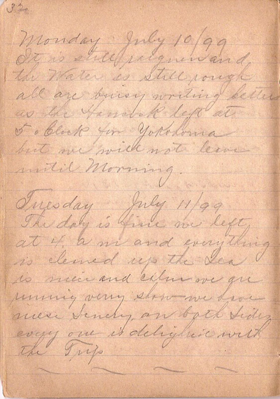 The day is fine we left at 4 am and everything is cleaned up the Sea is niece and calm we are running verry slow we have niese Senery on both Sides every one is delighted with the Trip |
